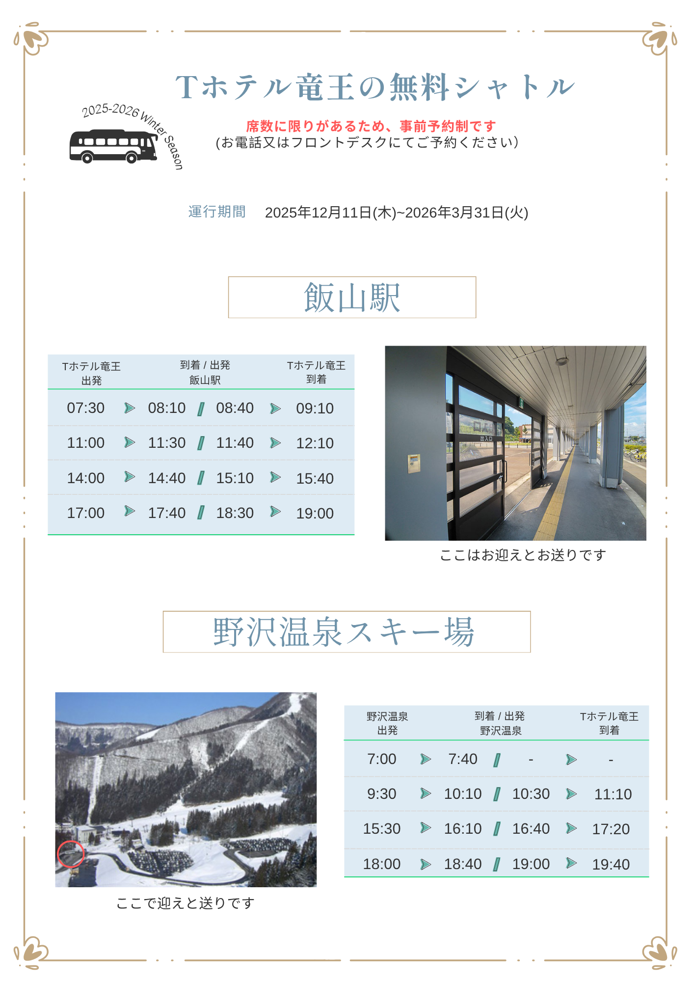 当ホテルでは、飯山駅と野沢温泉スキー場との無料シャトルバスも 2 便運行しています。